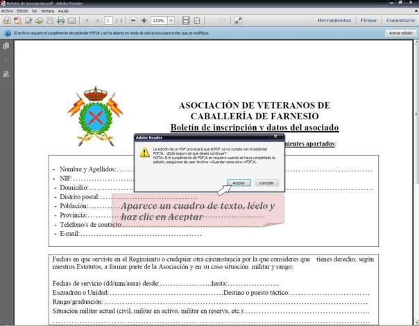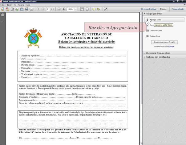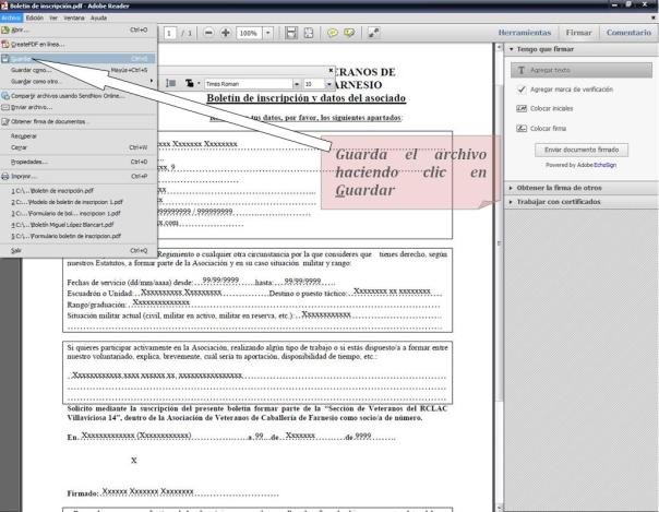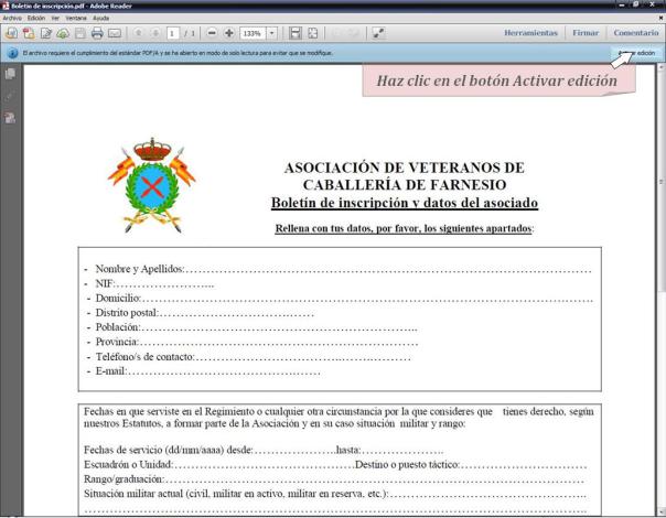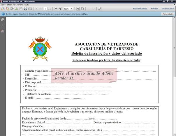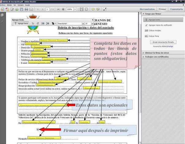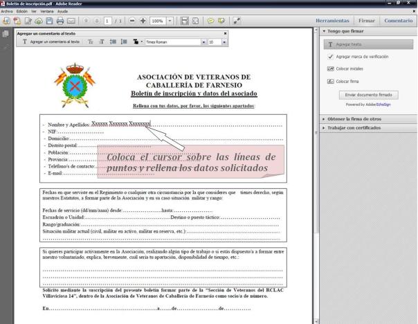 Una vez instalado Adobe Reader XI y descargado el boletín de inscripción en tu ordenador, cumplimenta el boletín rellenando todas las líneas de puntos. Para hacerte más fácil al tarea de rellenar el boletín sigue las instrucciones que te damos a continuación: