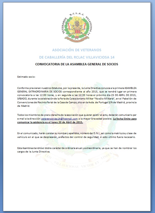 Se comunica a todos que se va a celebrar la primera Asamblea General de Socios de la Asociación de Veteranos de Caballería del RCLAC Villaviciosa 14, lo que se publica en este blog para conocimiento general.