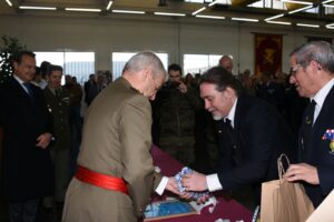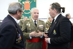 EN EL SALON DE ACTOS , EL TTE GENERAL MONTAÑO SE DIRIJE A LOS ALLÍ PRESENTES REALIZANDO UN DISCURSO DE SU SU TRAYECTORIA MILITAR , UNA VEZ FINALIZADO EL MISMO, LA ASOCIACIÓN DE VETERANOS DEL VILLAVICIOSAS 14 BAJO LA DIRECTRIZ DE SU PRESIDENTE, REALIZA LA ENTREGA DE UNOS DETALLES QUE TIENE LA ASOCIACIÓN, UN PREMIO DIPLOMA GENERAL CORISCO, UN PIE CON EL CORISCO Y UNA BANDERA MOCHILA DE LA ASOCIACIÓN .