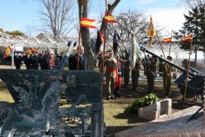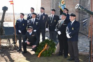 FORMACIÓN DELANTE DEL MISMO CON LOS GUIONES DELA FORMACIÓN A UN COSTADO, Y LOS BATIDORES CON LA CORONA QUE DEPOSITARAN EL SECRETARIO DE ESTADO Y EL TTE GENRAL MONTAÑO, MIENTRAS QUE TOCAN EL CORNETIN DE ORDENES Y LOS TAMBORES EL HIMNO A LOS CAIDOS.