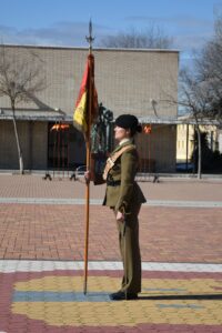 SE INICIAN LOS ACTOS CON LA ENTRADA EN EL PATIO DE ARMAS DEL ANTIGUO ESTANDARTE DEL REGIMIENTO LIGERO DE CABALLERIA VILLAVICIOSA 14. PORTANDOLA UN OFICIAL DEL REGIMIENTO VILLAVICIOSA XII. AL CUAL SE DIRIJE EL CAPITAN QUE MANDA LA FORMACIÓN A SU ENCUENTRO PARA ACOMPAÑARLO HASTA SU SITIO EN FORMACIÓN.