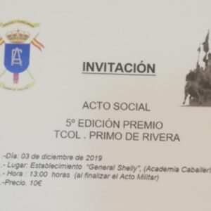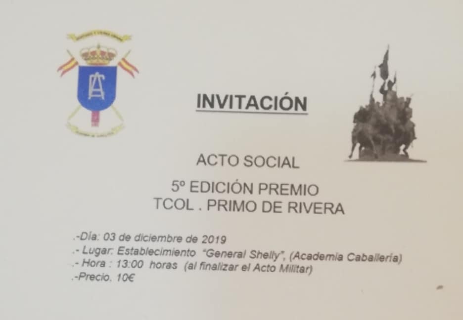 Está vez hemos sido invitados a la 5ª edición del Premio Tcol. Primo de Rivera, en la Academia de caballería. Lo recibió… el Excelentísimo Sr. General de División, D. Manuel Romero Carril, gran persona y mejor militar. Como siempre, la As. Vet. RCLAC «Villaviciosa»14, a la vanguardia, para explotar el éxito.