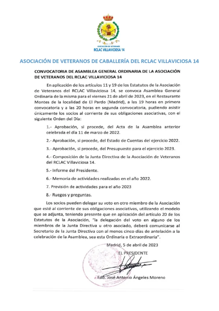 Se adjunta documento con el contenido de la Convocatoria, recordando que, tal y como se indica en la misma, la Asamblea General Ordinaria tendrá lugar el viernes 21 de abril de 2023, en el Restaurante Montes de la localidad de El Pardo (Madrid), a las 19:00 horas en primera convocatoria y a las 20:00 horas en segunda convocatoria.